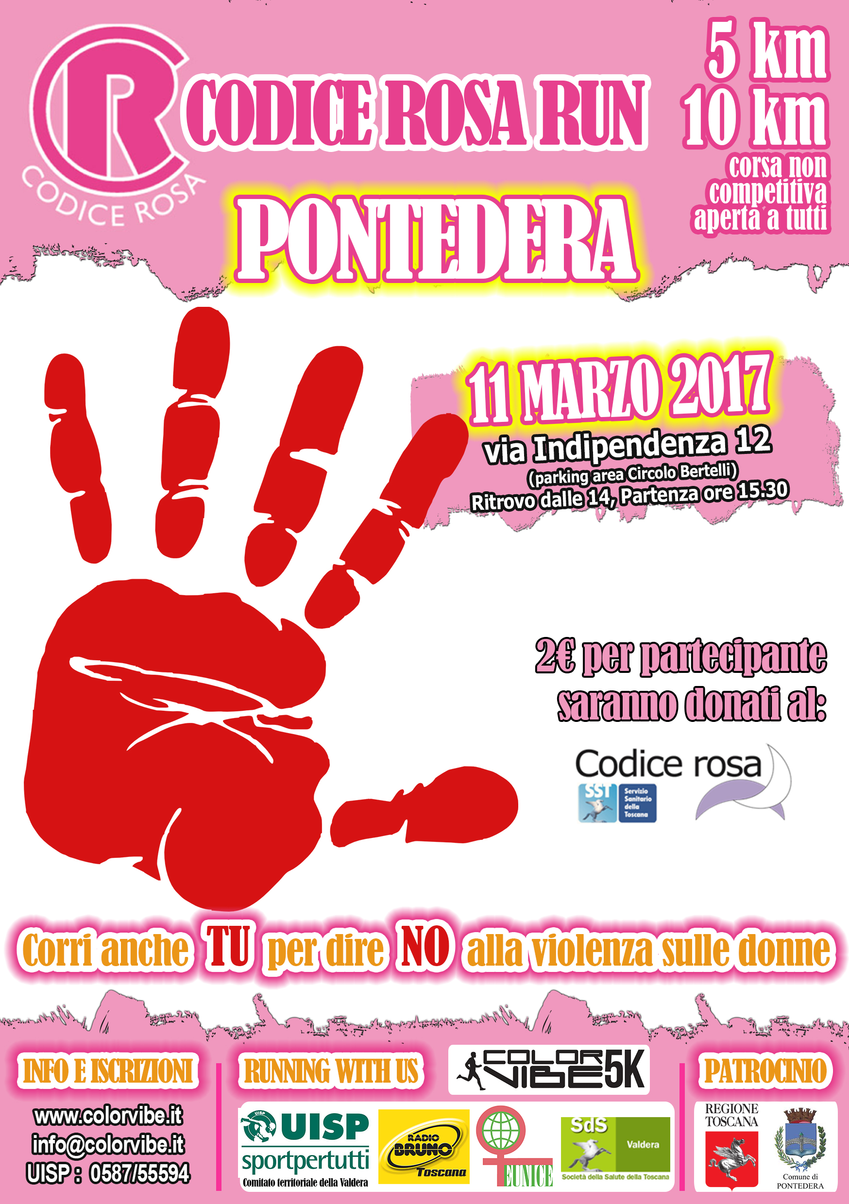2.00 € per ogni partecipante saranno devoluti al Codice Rosa. La somma ricavata verrà donata in occasione della Conferenza Stampa , che si terrà mercoledì 8 marzo 2017 presso la Sala Consiliare dell'Amministrazione Comunale di Pontedera.